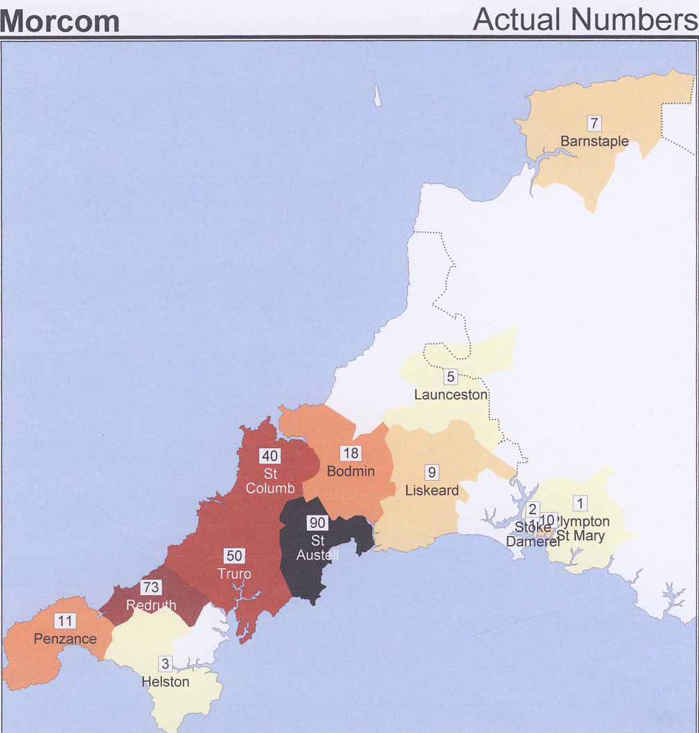 The maps below show the distribution of the MORCOMs, mapped by actual numbers in each registration district of the 1881 census, and also calculated as the density of the surname per 100,000 of the total population. Variants are disregarded, but would have been less common by this time. The maps are a "snapshot" at a time when there had already been large scale outflow to other UK counties and to overseas. The eastward movement of mining communities was well established by 1881