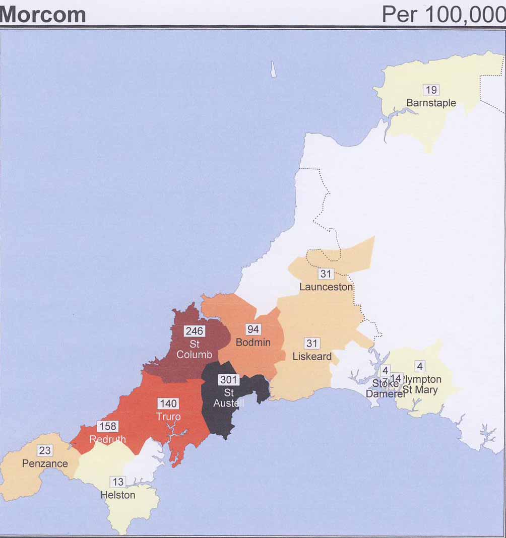 The maps below show the distribution of the MORCOMs, mapped by actual numbers in each registration district of the 1881 census, and also calculated as the density of the surname per 100,000 of the total population. Variants are disregarded, but would have been less common by this time. The maps are a "snapshot" at a time when there had already been large scale outflow to other UK counties and to overseas. The eastward movement of mining communities was well established by 1881